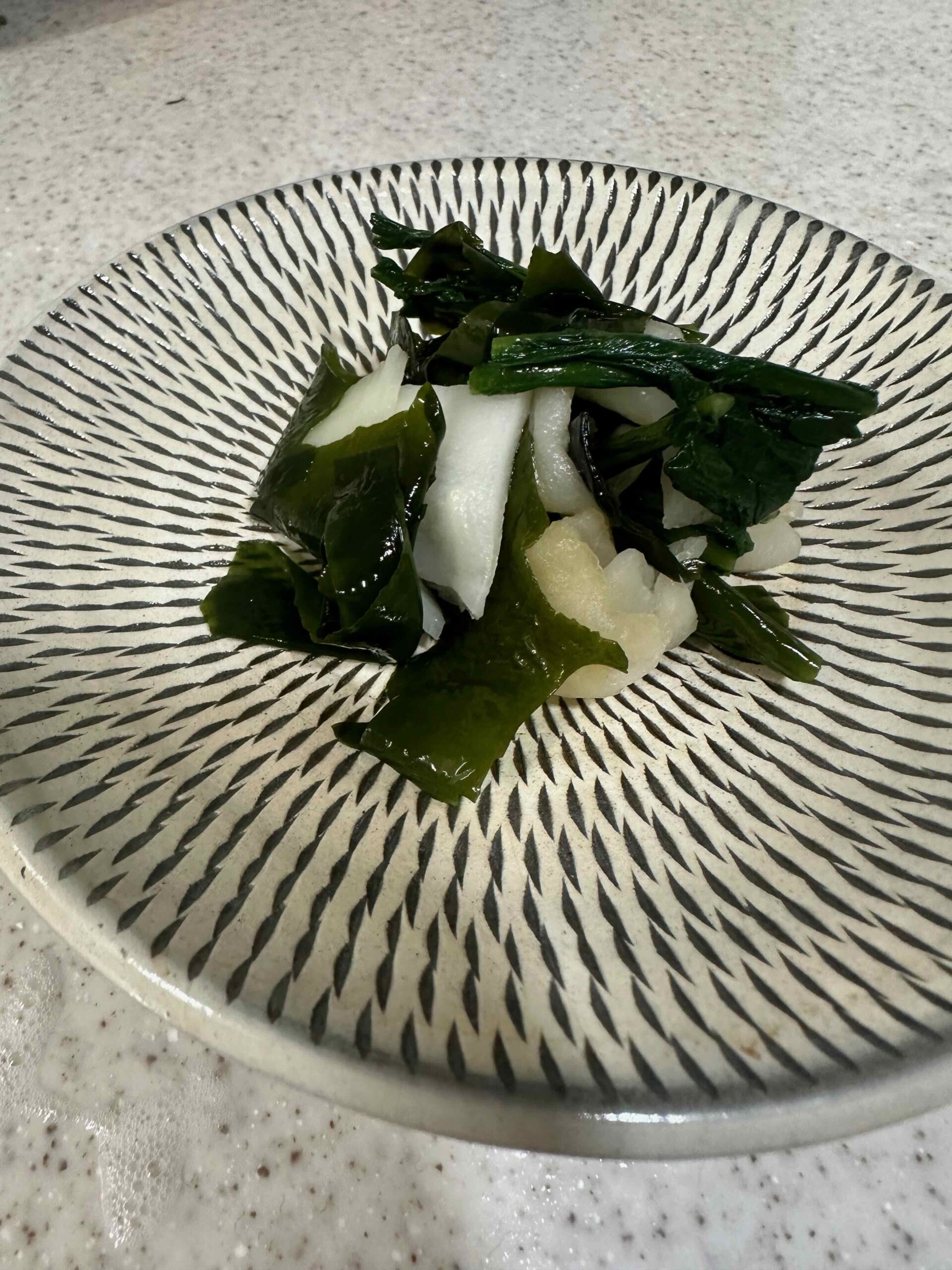 ④かんぴょう、わかめ、春菊を根昆布だしで和える
