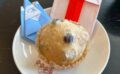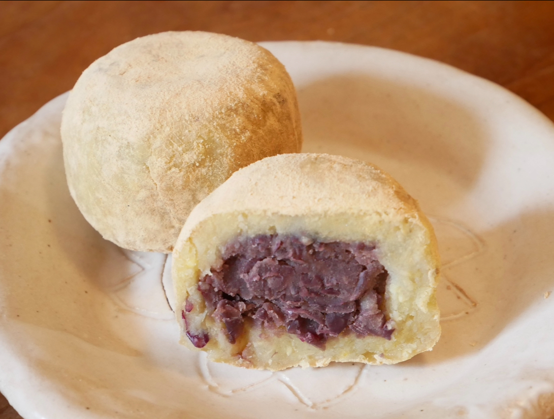 ⑤④を50gずつ丸め、ラップに挟んで潰し、中央に丸めたあんこ(20g)を乗せて皮で包む。きな粉をまぶしていただく。