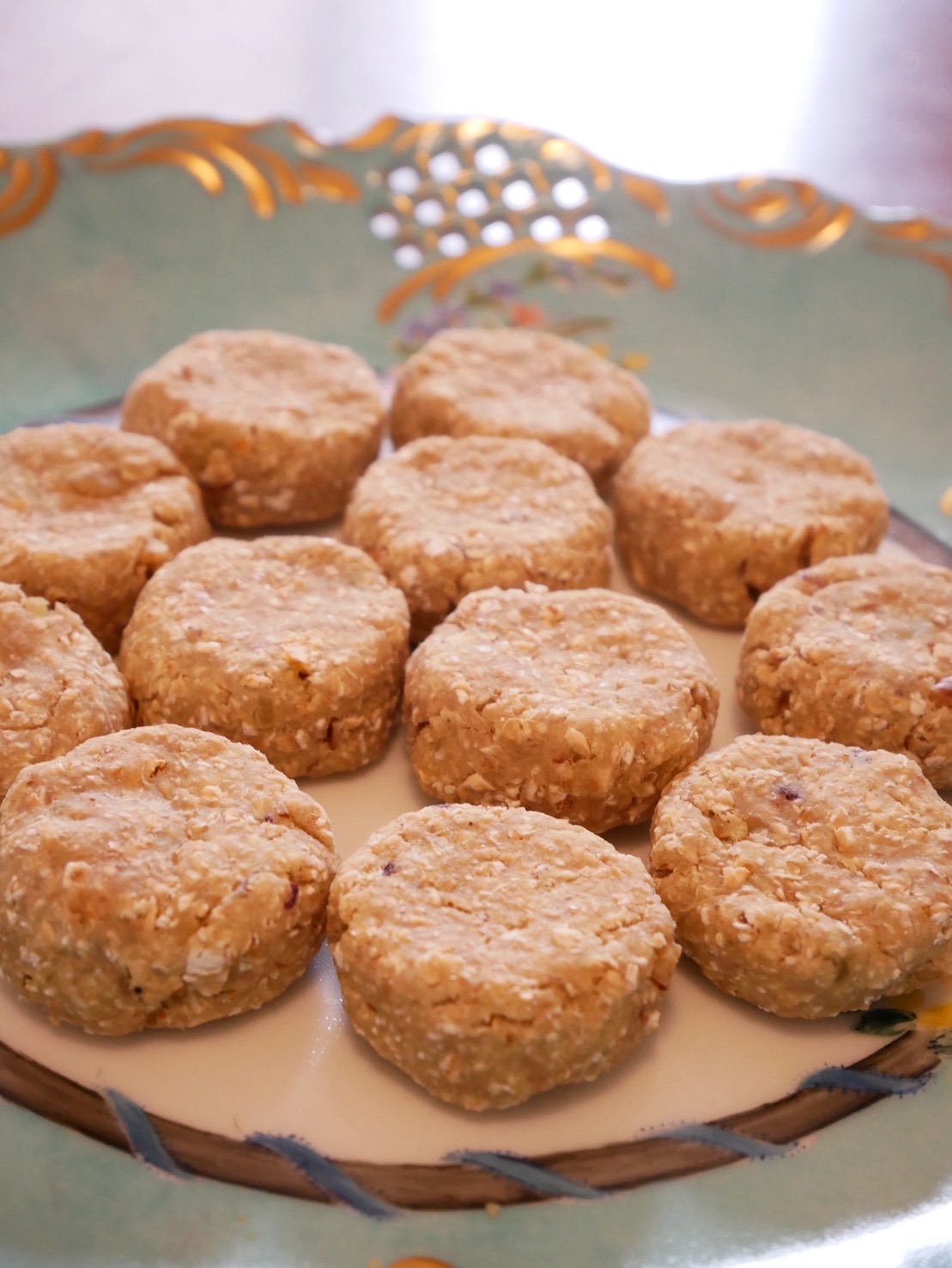 さつま芋で気力を増しながら、オートミールと陳皮も合わせて余分な湿を吸って流し、巡りも良くするクッキーレシピです。陳皮は温州みかんの皮を天日で乾燥させたものです。粉にして少し混ぜておくと、むくみを吸ったり、気の巡りを良くするのを手伝っくれます。胡桃は香ばしく煎ってから使いました。吸った湿を血液循環に乗せて腎で利尿するという、意念を込めて混ぜます。