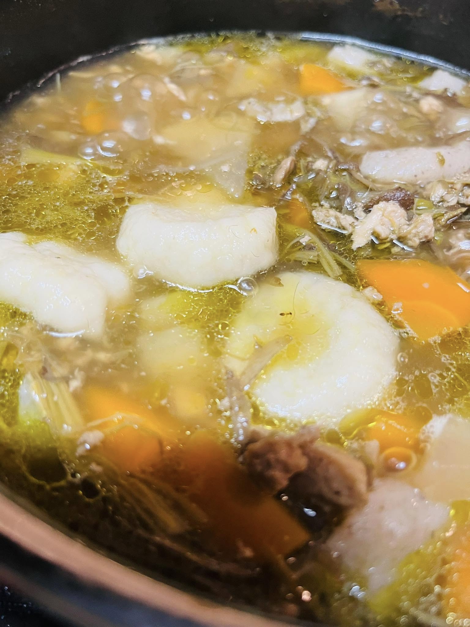 7,鶏肉一口大を入れて炒める。火が通ったら、4の出汁(ひき肉も入れる)と2のすいとんを入れ、きかせたい場所まで、きかせたい火加減で火を入れる。