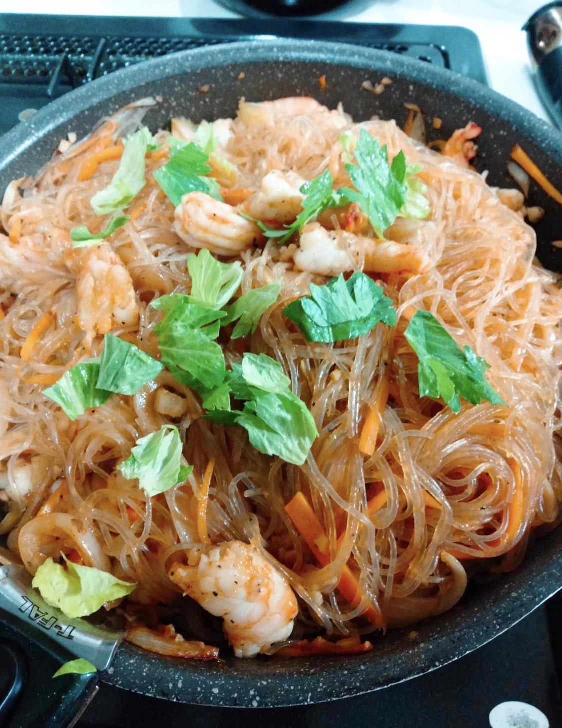 ③②のフライパンで野菜を炒める。野菜がしんなりしたら、戻した春雨と合わせ調味料を加えてよく混ぜ、エビも入れて塩コショウして混ぜ合わせる。