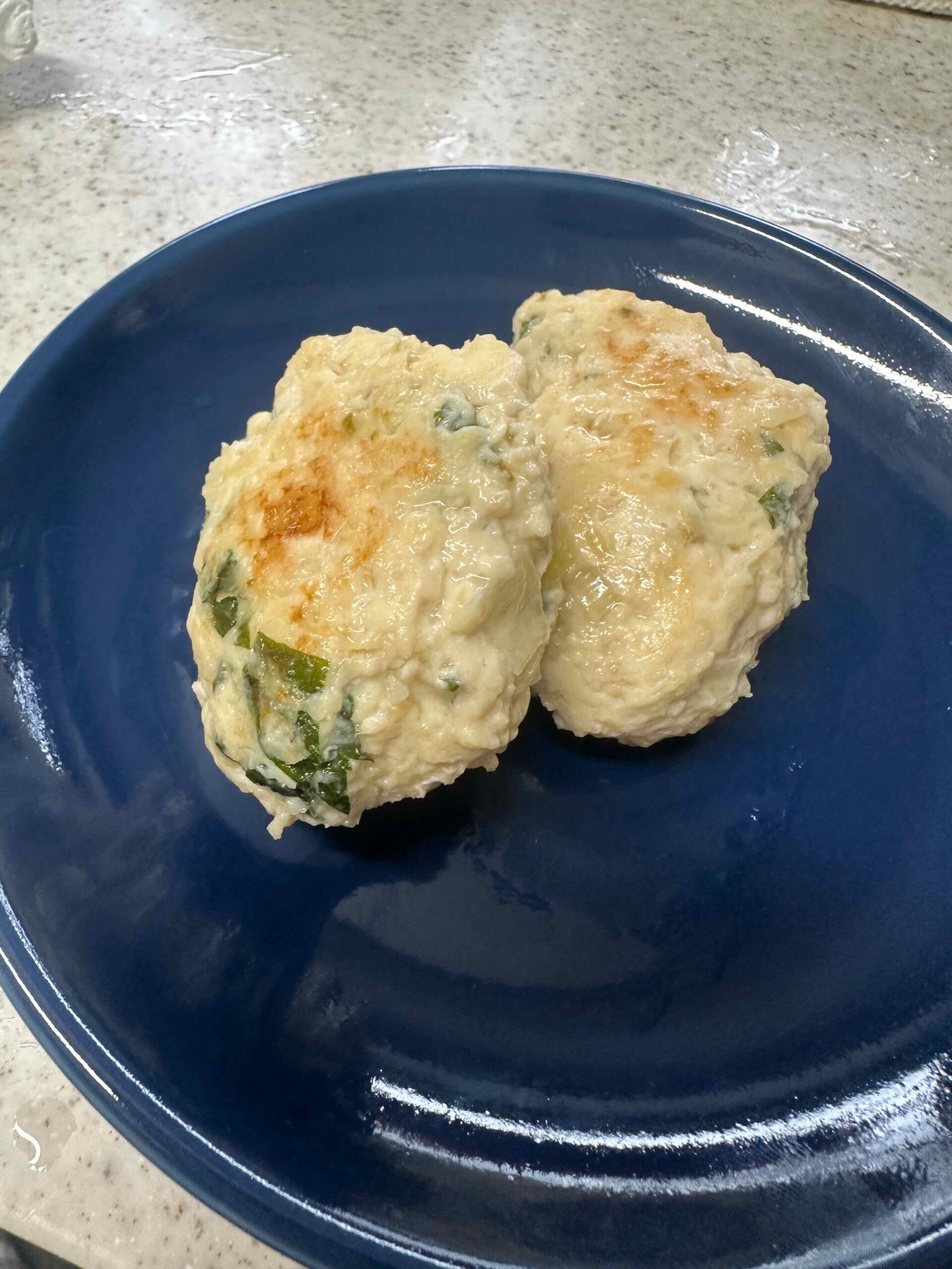 ④フライパンに油をひき成形したひき肉を入れ、弱火で両面に焼き色をつける(この時点で鶏肉にある程度火が通っているようにする)