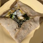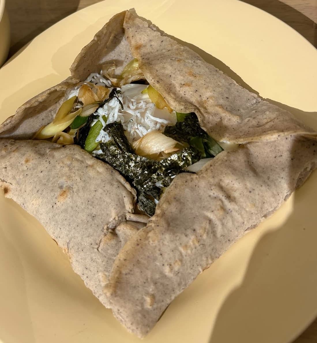 • 余分な湿を取ってくれる蕎麦粉、黒豆きな粉でガレット生地を作りました。しらす・焼きのりの鹹味、焦がした白ねぎの苦味で、水の排出を促します。卵で補気養血。体の正気を補い、排出する力を支えます。